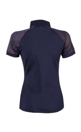 Shirt met korte mouw, opstaande kraag met een korte ritssluiting, mouwtjes met een leuke goudkleurige print en op de borst een Equestrian Society logo met kristallen.
