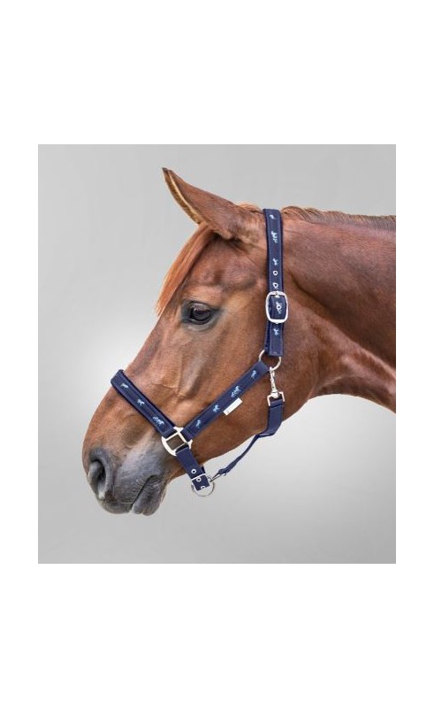 Halster met paardenapplicaties. Neusriem en kopstuk zijn zacht gevoerd, stevige glanzende fittingen, meervoudig verstelbaar op kinriem en kopstuk.