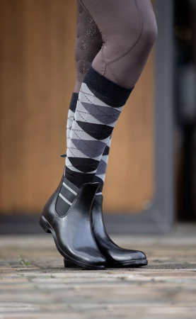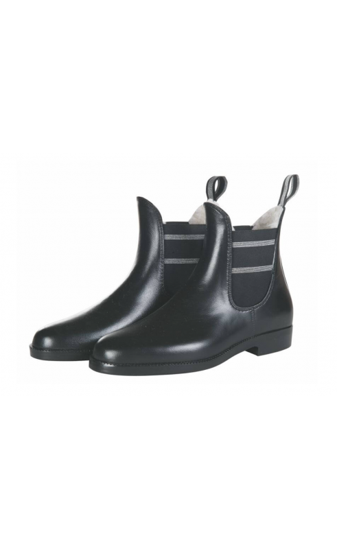 Waterdichte, gevoerde rubber jodhpurs voor dames, heren en kinderen in leerlook. De teddyfleece voering zorgt voor uitstekende warmte en houdt de voeten zelfs in de winter behaaglijk warm. Door middel van lusjes en elastische inzetstukken kunnen de jodhpurs gemakkelijk worden aangetrokken.