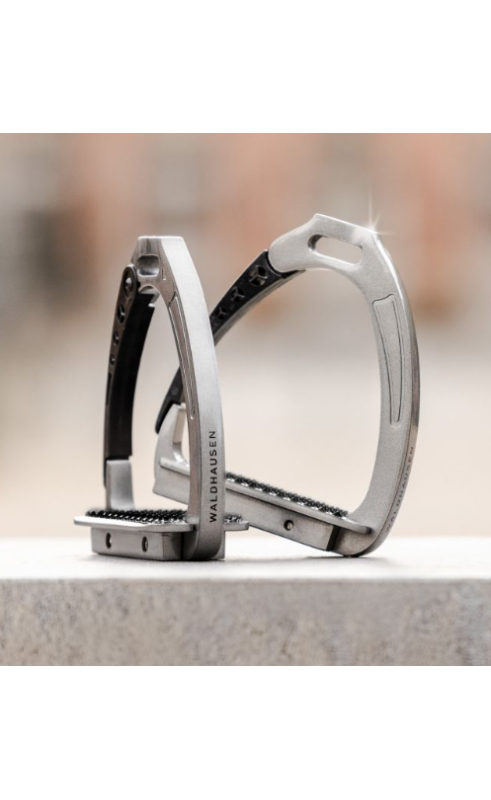 Stijgbeugels van hoogwaardig aluminium met een loopvlak van 6,5 cm breed. Met een scharnier aan de buitenkant. Het scharnier gaat open door het gewicht van de ruiter bij een val en voorkomt dat deze vast komt te zitten in de stijgbeugel.