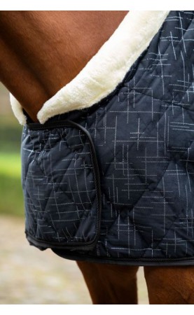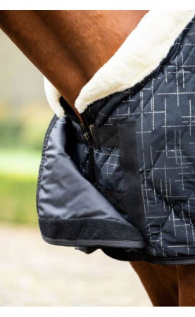 De Port Royal transportdeken geeft paarden en pony's een bijna majestueuze uitstraling. De deken is gemaakt van fijne fluwelen stof met een zilveren glitterprint en heeft een binnenvoering van knuffelig teddybont. Een grote kraag van imitatiebont onderstreept de edele uitstraling van de deken en voorkomt schuren aan de basis van de nek van het paard. De transportdeken is gemaakt van hoogwaardig, ademend materiaal en biedt optimale zweetabsorptie. Verstelbare kruisbanden, een staartriem en metalen sluitingen aan de voorkant, voor op de borst, zorgen ervoor dat de deken goed blijft zitten. De metalen sluitingen aan de voorkant zijn extra bedekt met een klein slabbetje dat met klittenband wordt gesloten.