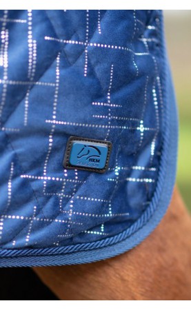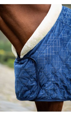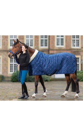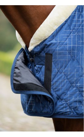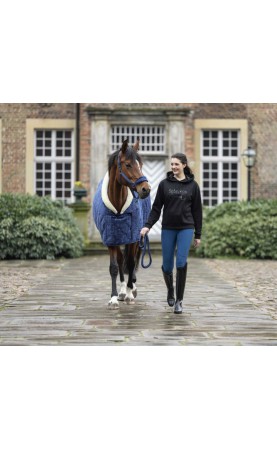 De Port Royal transportdeken geeft paarden en pony's een bijna majestueuze uitstraling. De deken is gemaakt van fijne fluwelen stof met een zilveren glitterprint en heeft een binnenvoering van knuffelig teddybont. Een grote kraag van imitatiebont onderstreept de edele uitstraling van de deken en voorkomt schuren aan de basis van de nek van het paard. De transportdeken is gemaakt van hoogwaardig, ademend materiaal en biedt optimale zweetabsorptie. Verstelbare kruisbanden, een staartriem en metalen sluitingen aan de voorkant, voor op de borst, zorgen ervoor dat de deken goed blijft zitten. De metalen sluitingen aan de voorkant zijn extra bedekt met een klein slabbetje dat met klittenband wordt gesloten.
